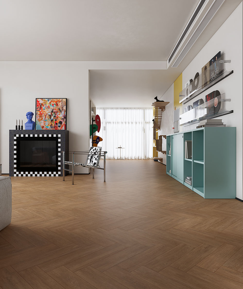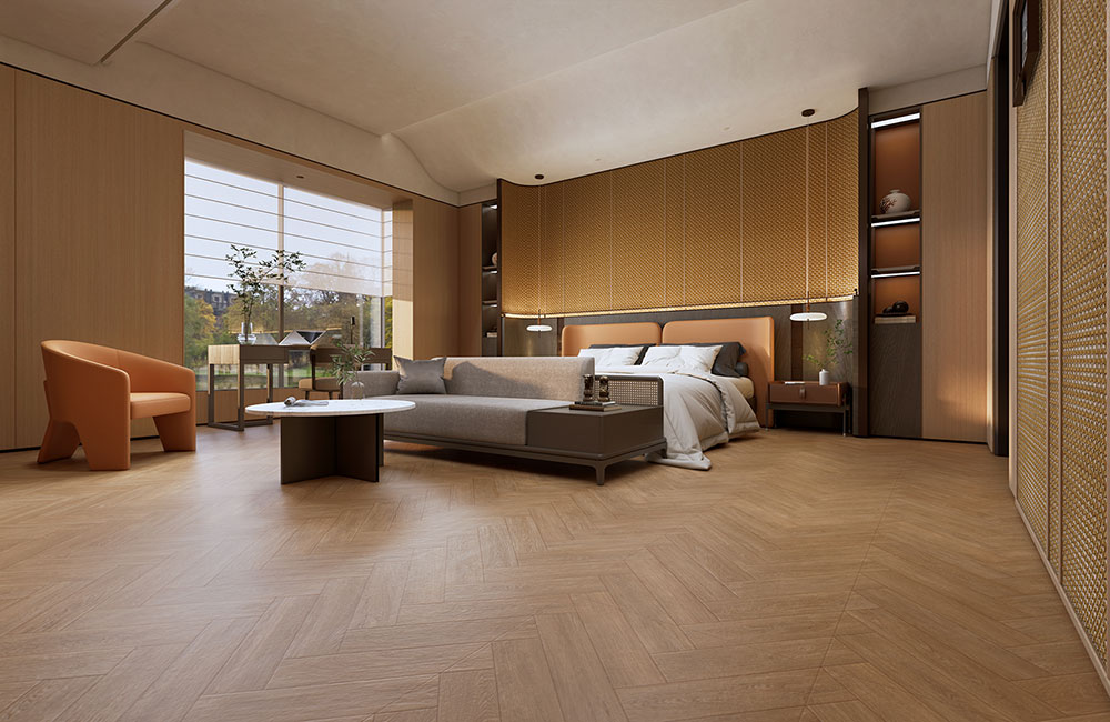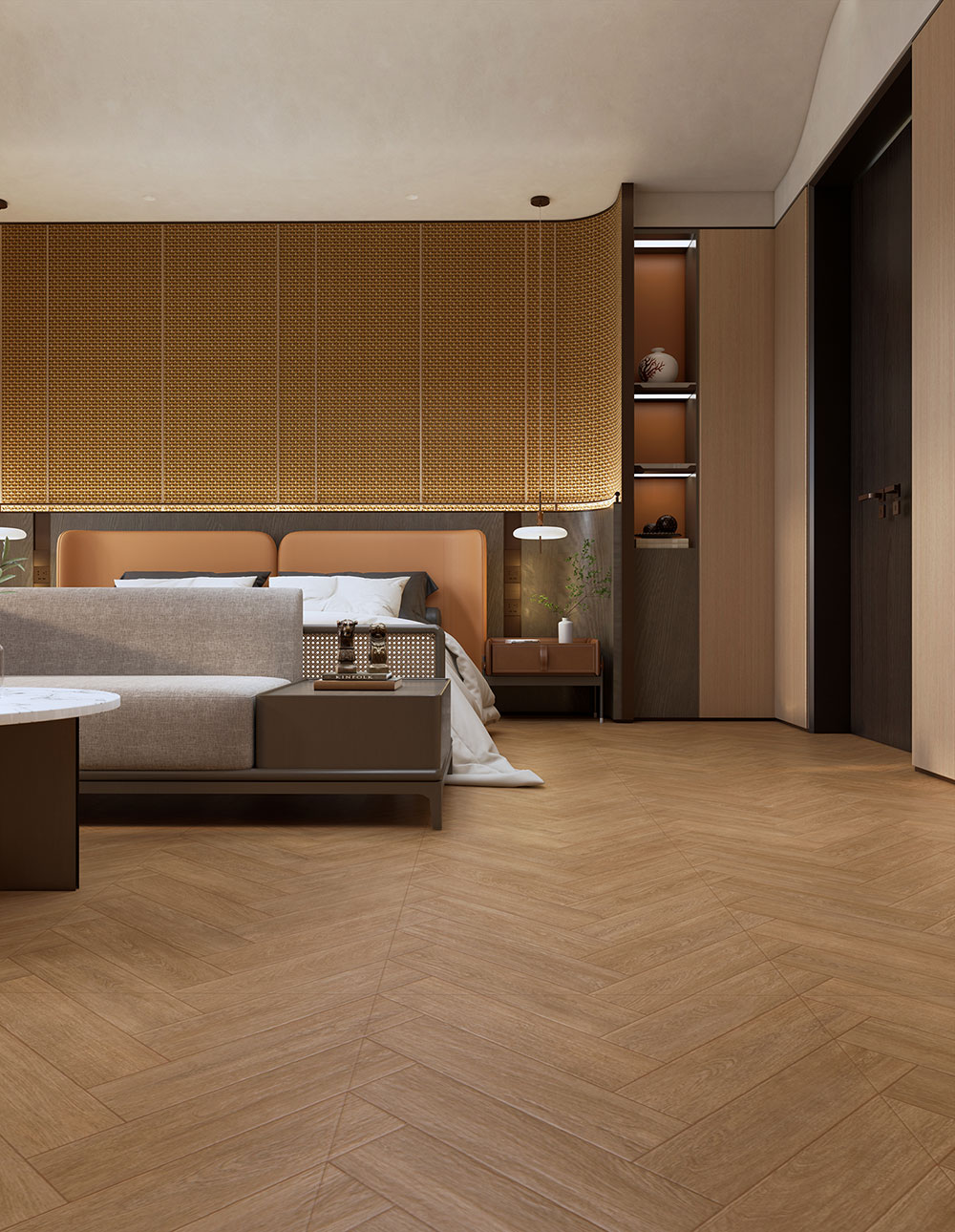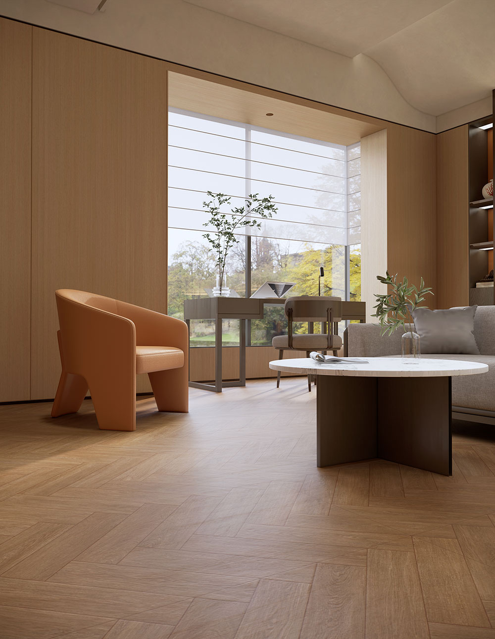 产品描述:人字形肌理以极简笔触勾连自然韵律,深浅交织的微痕如书页疏影,在空间铺展沉静栖居的诗性语境。