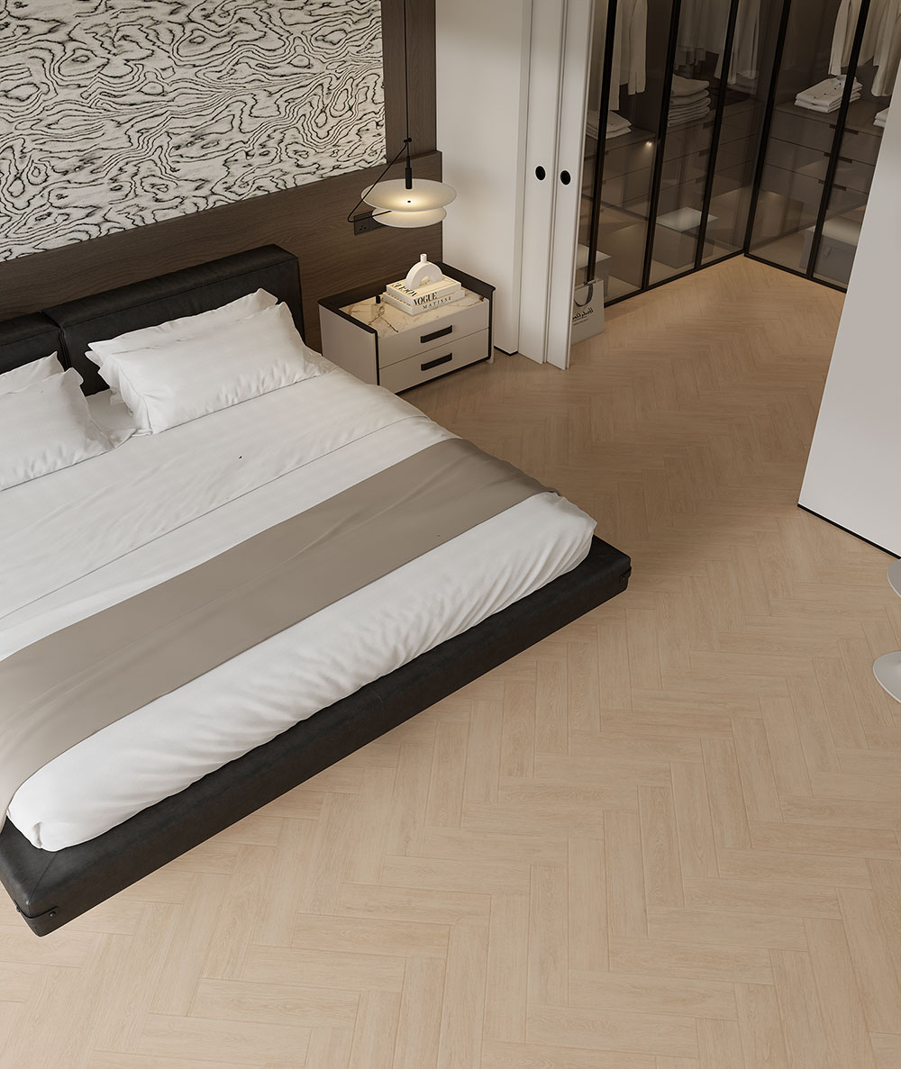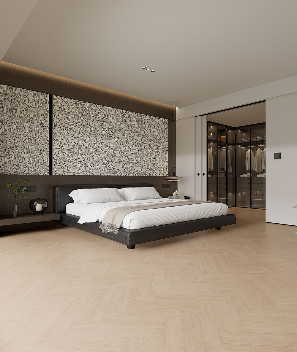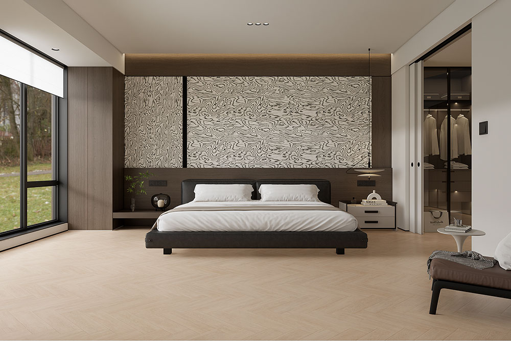 产品描述:人字形肌理以极简笔触勾连自然韵律,深浅交织的微痕如书页疏影,在空间铺展沉静栖居的诗性语境。